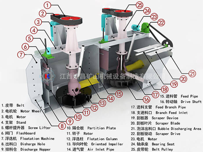XJK(A型)浮選機設備主要由轉子、導向葉輪、隔倉板、刮板器、刮板驅動等部分組成。