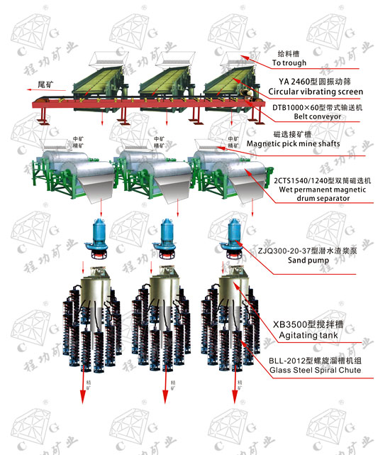 日處理10000t/d海濱鐵砂礦(原礦)選礦工藝設(shè)備流程圖 Daily processing 10000t / d of iron ore (ore) mineral processing technology and equipment flow chart